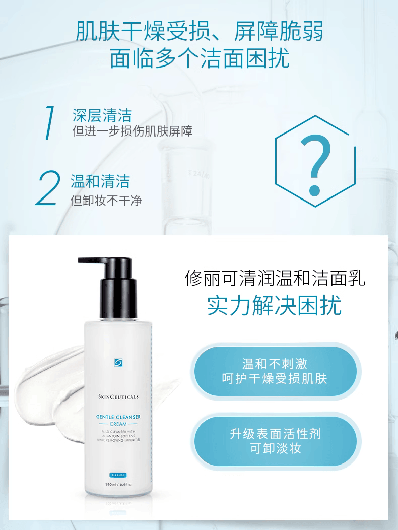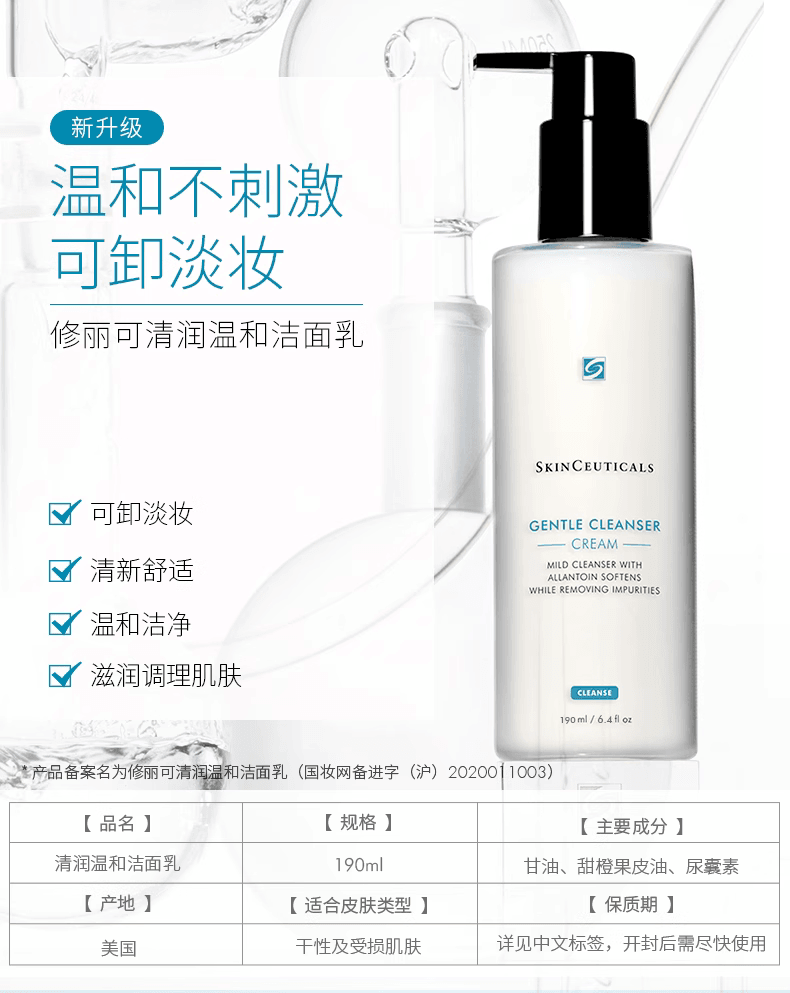 SkinCeuticals Gentle Cleanser 是一款专为敏感和干燥肌肤研发的温和型洁面乳。其配方含有芦荟提取物与甘油,能够在清洁的同时舒缓并滋润肌肤,不会带来紧绷感。乳霜质地细腻,能有效去除面部杂质、彩妆残留及多余油脂,令肌肤保持洁净、柔软和舒适。