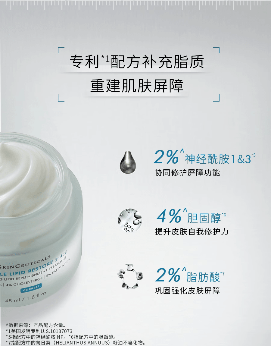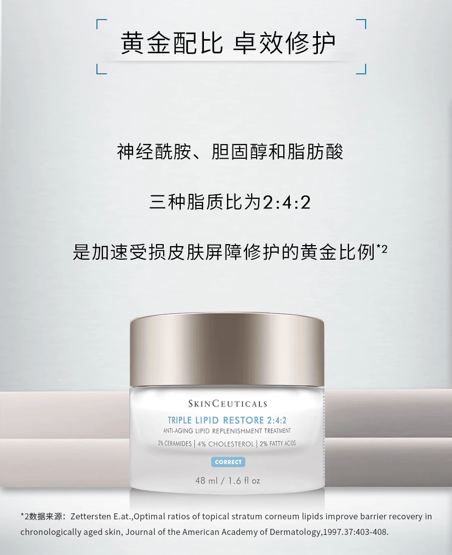 SkinCeuticals Triple Lipid Restore 2:4:2 是一款专为成熟肌与屏障受损肌肤设计的抗老修护面霜。其独特的 2:4:2 配方比例(2% 神经酰胺、4% 胆固醇、2% 脂肪酸)有效补充肌肤所需的关键脂质,帮助修复屏障、提升弹性,让肌肤焕现紧致与光泽。